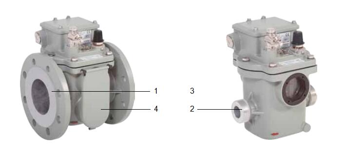 殼體是由耐氣候變化的鑄鋁合金制成,表層已涂色. 依照結(jié)構(gòu)設(shè)計(jì)形式可分為法蘭盤(圖3中1)連接或螺紋連接(圖3中2). 對殼體的變型品種選項(xiàng)將在下文第5點(diǎn)(單浮子瓦斯繼電器)和第7點(diǎn)( 雙浮子瓦斯繼電器)中加以說明. 其他選項(xiàng)歡迎垂詢.
