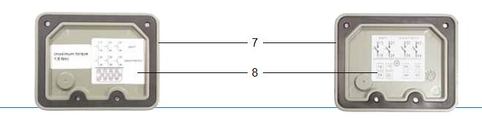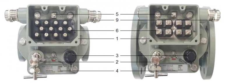 頂蓋是由耐氣候變化的鑄鋁合金制成,表層已涂色. 頂蓋部件上部有一個(gè)接線盒(圖4中1),在接線盒前面有一個(gè)放氣閥(圖4中2)和一個(gè)用悶蓋螺母(圖4中3)覆蓋的測試按鈕,同時(shí)上面還附有一個(gè)測試按鈕操作說明標(biāo)牌(圖4中4). 接線盒中除了有一個(gè)接地點(diǎn)(圖4中5)外,頂蓋底板內(nèi)還裝有電力引線端子(圖4中6). 通過電力引線端子的數(shù)量可以決定涉及干簧管類型與數(shù)量的開關(guān)系統(tǒng)的布線配置.